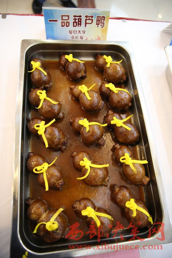 在長達數(shù)個小時的比賽中,來自37所上海高校的100多位廚師輪流上陣,共制作出菜品111個。圖為復(fù)旦大學(xué)一品葫蘆鴨。
