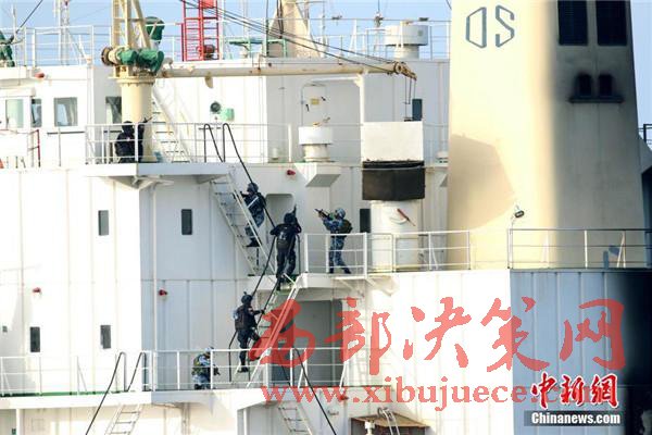 圖為特戰(zhàn)隊(duì)員快速登入商船展開(kāi)營(yíng)救活動(dòng)。