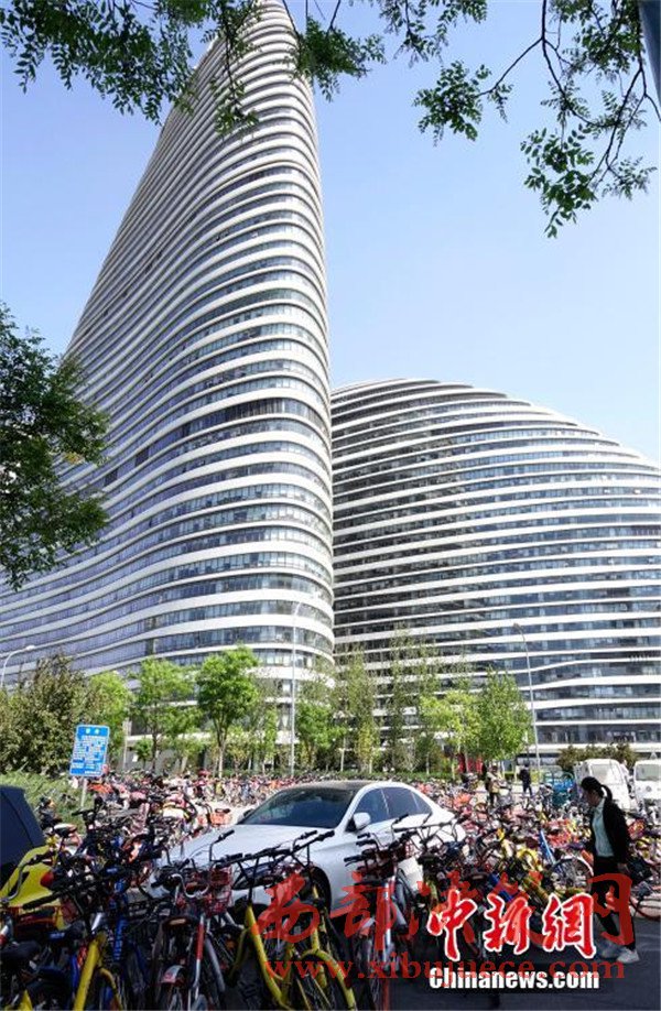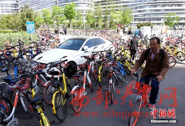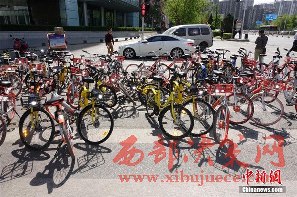 一輛私家車(chē)被各家公司、不同顏色的“共享單車(chē)”層層包圍。