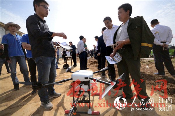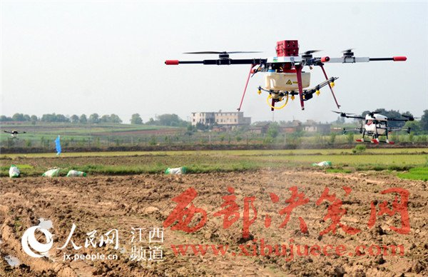 4月18日,江西省奉新縣宋埠鎮(zhèn)橋頭村奉新縣建華農(nóng)機合作社的稻田上空,數(shù)架無人機正在“嗡嗡”作業(yè),農(nóng)技員正在展示植保無人機噴灑農(nóng)藥的功能。
