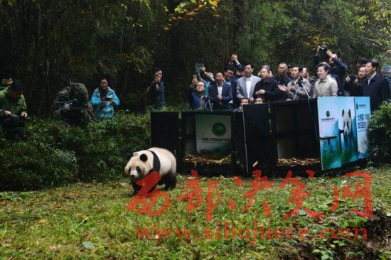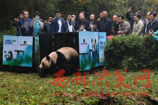 大熊貓“華妍”離開運輸籠向野外走去