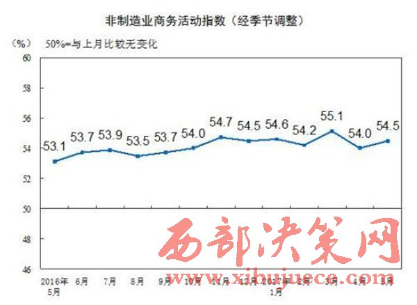 記者5月31日從中國物流與采購聯(lián)合會(huì)獲悉,今年5月份中國非制造業(yè)商務(wù)活動(dòng)指數(shù)為54.5%,環(huán)比上升0.5個(gè)百分點(diǎn)。分析稱,這表明中國經(jīng)濟(jì)結(jié)構(gòu)優(yōu)化升級(jí)的動(dòng)力在進(jìn)一步增強(qiáng)。