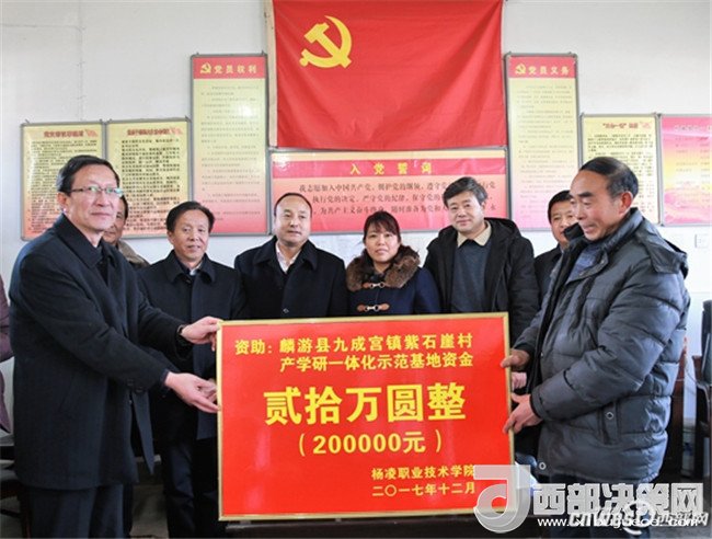 12月15日,為為貫徹落實 《全省脫貧攻堅 2017冬季行動方案》精神,扎實推進高校結(jié)對幫扶“雙百工程”,有效地為當?shù)靥厣a(chǎn)業(yè)服務(wù),楊凌職業(yè)技術(shù)學院黨委書記趙曼、黨委副書記任得元一行來到麟游縣九成宮鎮(zhèn)紫石崖村,為該村捐贈20萬元,用于建立中蜂養(yǎng)殖產(chǎn)學研一體化示范基地、核桃豐產(chǎn)栽培產(chǎn)學研一體化示范基地及電商網(wǎng)絡(luò)平臺。