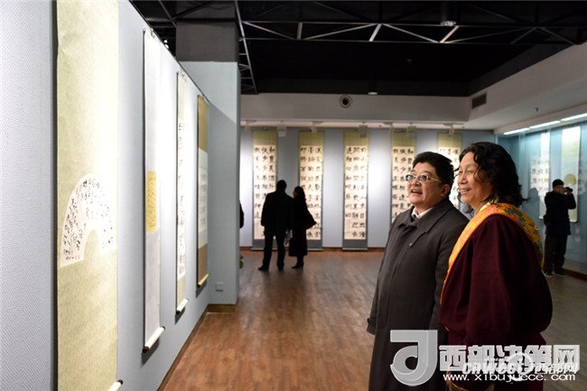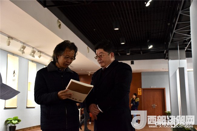 西安工業(yè)大學(xué)黨委副書(shū)記于孟晨、甘肅省書(shū)協(xié)副主席王青彥一同觀看“和天下”書(shū)法展。