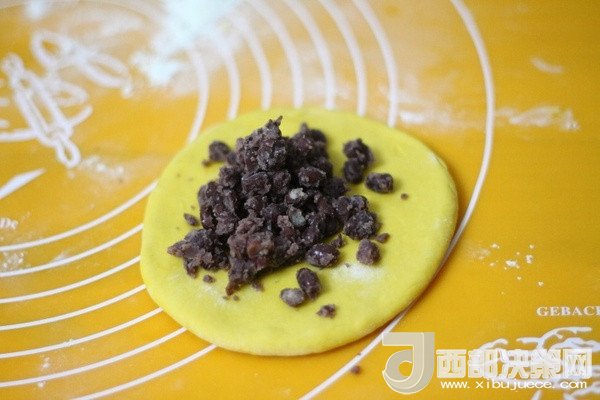 5、取其中一個面團(tuán)搟成小圓形,放入適量蜜豆。