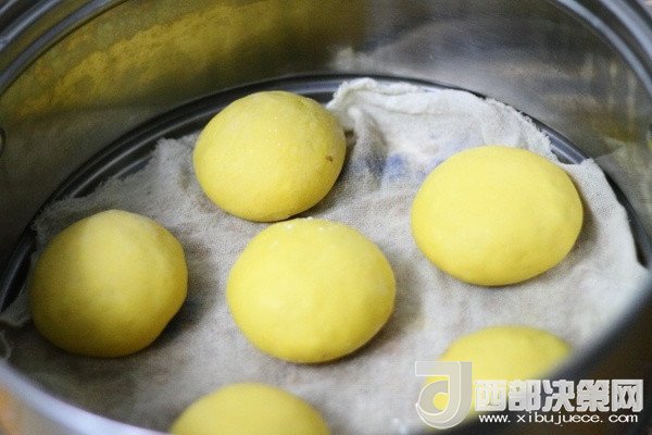 7、重復(fù)上述步驟做剩余的蜜豆包,全部做完后放蒸鍋中放置10—15分鐘左右,煤氣灶開火燒水,待水燒開后將蜜豆包放上去蒸15分鐘左右關(guān)火。