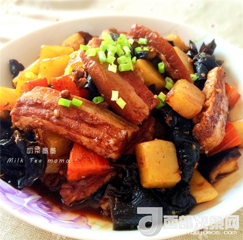 五花肉300克、土豆1個(gè)、胡蘿卜1個(gè)、黑木耳10克、香菇2朵。