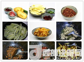 第四步:鍋中倒入適量的油(比平時炒菜的量要多一點),然后把土豆條放入鍋中,中小火開始煸炒。