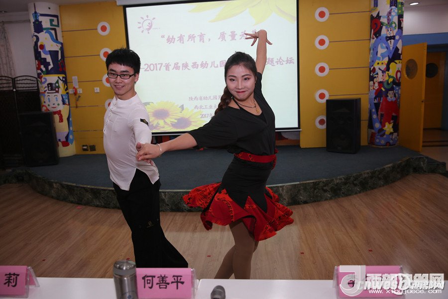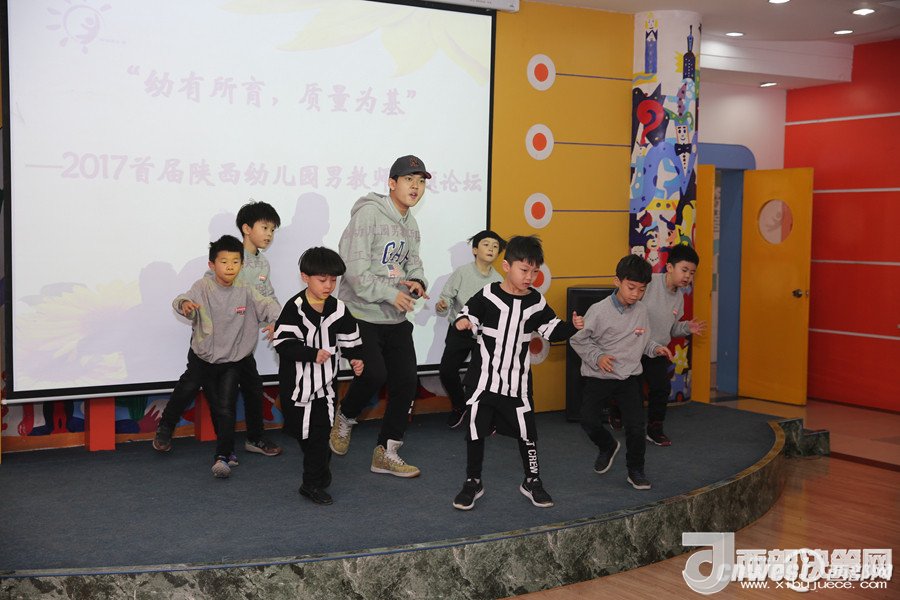 論壇上,西安市浐灞第二幼兒園的謝曉鳴和孩子們帶來的街舞表演點燃了全場,讓大家感受到幼兒園男教師的熱情和激情;陜西師范大學(xué)幼兒園的韓凱帶來的鋼琴演奏《一壺美酒》傳達了深切的情感,讓人回味無窮;西航天鼎保育院的趙棟用挺拔健美的身姿表演的拉丁串燒,展現(xiàn)了生命自信的力量;電信十所幼兒園的孫博一只單簧管演奏,吹出了男教師細致柔情的一面;西安市雁塔區(qū)第一幼兒園的陳曉峰演唱的《祖國,慈祥的母親》讓我們領(lǐng)略了幼兒園男教師專業(yè)的唱功和對職業(yè)的自信;西北工業(yè)大學(xué)幼兒園教師董樂帶領(lǐng)小朋友展示了動感的啦啦操和籃球活動,場上的小運動員自信的運球、上籃、投球,矯健的身姿,專注的表情,默契的配合,感染著在場的每一位教師;西安市第五保育院肖波和陜西睿星體育一群陽光帥氣的男教師組織的趣味體能游戲?qū)⒒顒託夥胀葡蛄烁叱薄?/p>