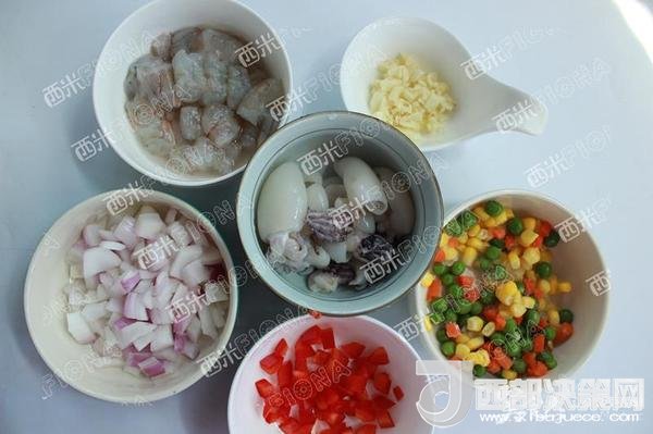蝦去頭去殼去蝦線,蝦比較大的話就切成較大的丁。墨魚仔處理干凈后,開水里焯燙十幾秒撈出。洋蔥,彩椒切丁。