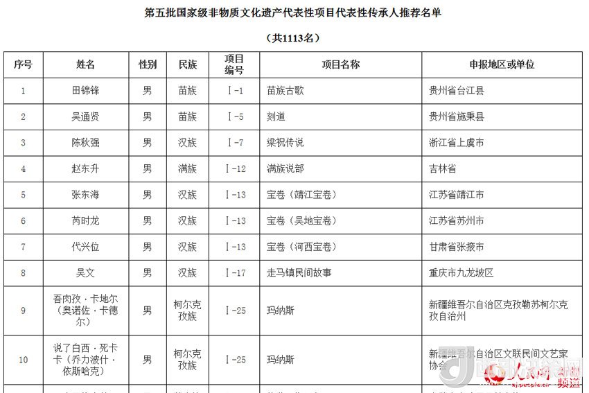 在各地推薦申報(bào)的基礎(chǔ)上,各評(píng)審組專家對(duì)全國(guó)31個(gè)?。▍^(qū)、市)、新疆生產(chǎn)建設(shè)兵團(tuán)、中央有關(guān)部門及港澳地區(qū)推薦的申報(bào)人進(jìn)行了評(píng)審,經(jīng)評(píng)審委員會(huì)審議,提出了第五批國(guó)家級(jí)非物質(zhì)文化遺產(chǎn)代表性項(xiàng)目代表性傳承人推薦名單(共1113人)。其中對(duì)尚未認(rèn)定過國(guó)家級(jí)代表性傳承人的項(xiàng)目,本次推薦827人,對(duì)已認(rèn)定過國(guó)家級(jí)代表性傳承人的項(xiàng)目,本次推薦286人。