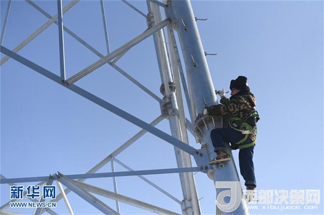 1月26日,國(guó)家電網(wǎng)長(zhǎng)春供電公司輸電運(yùn)檢室?guī)щ娮鳂I(yè)班班長(zhǎng)楊忠武徒手爬上高壓線塔。新華社記者 張楠 攝