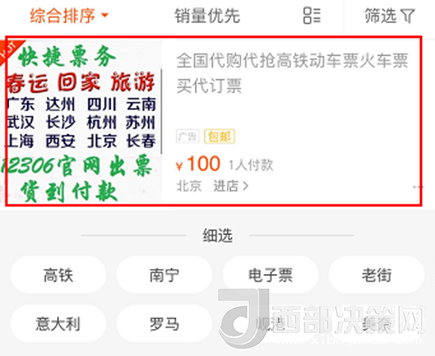 1月30日下午,人民網(wǎng)IT頻道在某著名電商平臺(tái)搜索“火車票代購(gòu)”,在首屏也能搜到疑似黃牛的賣家,其廣告圖片里就有“春節(jié)回家、12306官網(wǎng)出票”等字樣,標(biāo)價(jià)為100元,與這篇報(bào)道的黃牛加價(jià)情況基本一致。