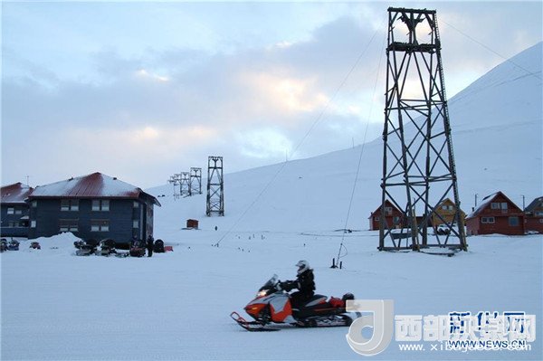2月25日,在挪威斯瓦爾巴群島首府朗伊爾城,一輛雪地摩托車從已廢棄的運(yùn)煤纜車架前駛過。新華社記者梁有昶攝