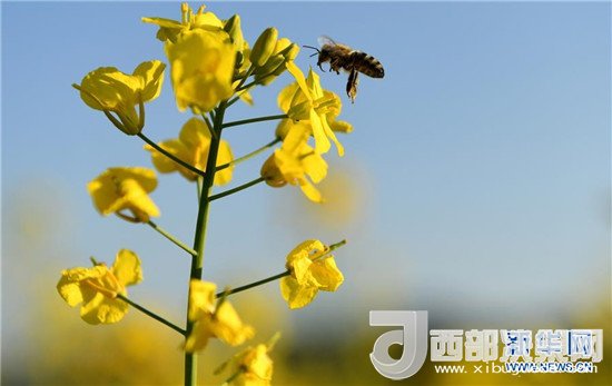 一只蜜蜂在云南省羅平縣盛開(kāi)的油菜花旁準(zhǔn)備采蜜(2月28日攝)。新華社記者 藺以光 攝