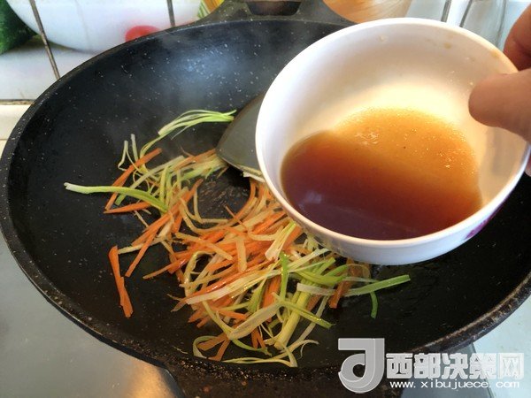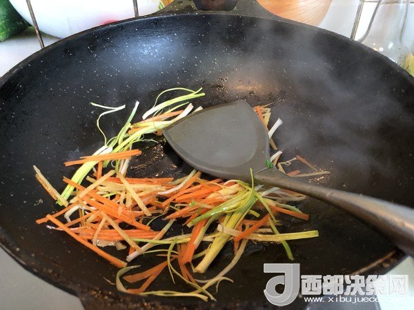 12.另起油鍋爆香姜絲,再放入胡蘿卜絲和蔥絲炒勻