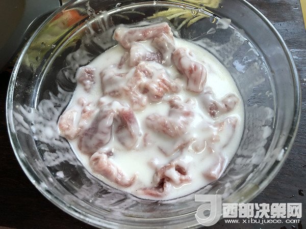 1.里脊肉切成5厘米寬、0.2厘米厚的肉片