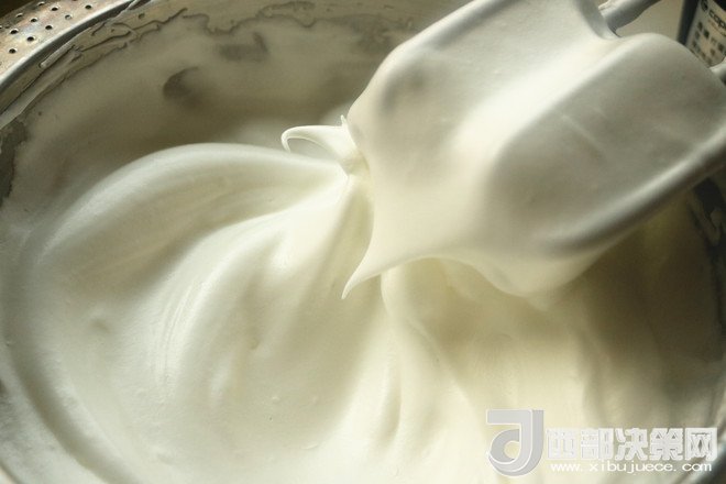 5.蛋白加入幾滴檸檬汁,攪拌至大粗泡時(shí)加入三分之一白砂糖,繼續(xù)打發(fā)到蛋白體積膨大到2倍時(shí),再加入三分之一白砂糖。繼續(xù)打發(fā)到剛剛出現(xiàn)彎鉤還很軟的時(shí)候,加入最后的三分之一砂糖。再打發(fā)到濕性發(fā)泡,也就是有大彎鉤的狀態(tài)就好,蛋糕卷不需要打發(fā)太干,避免卷的時(shí)候開裂。