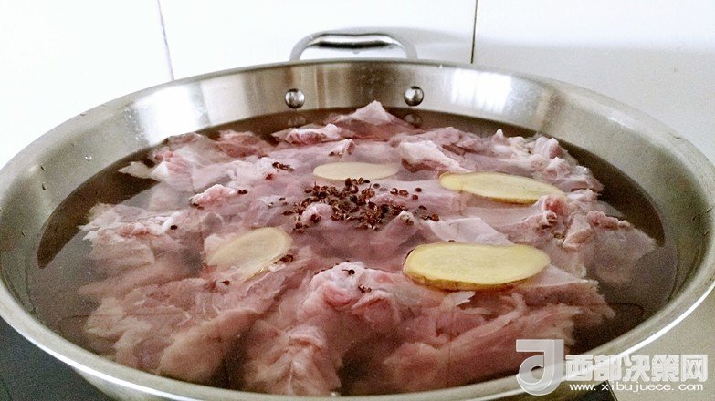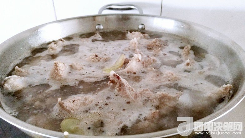 3.鍋中放入清水,排骨,花椒粒,姜片適量進行焯水。