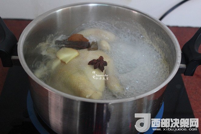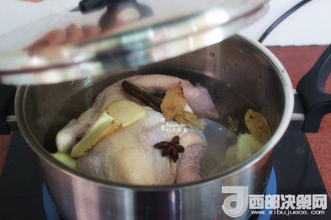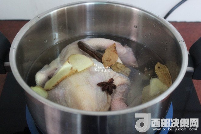 3.把洗凈的整只雞放入鍋中,然后放桂皮、生姜、香葉、八角,料酒、鹽,再倒入適量的清水,水要浸沒(méi)整只雞即可;