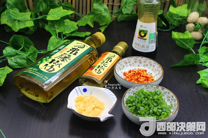 7.等待放涼的時(shí)候,把拌料準(zhǔn)備好,生抽和麻油倒入拌均,辣椒、蒜泥、香蔥等準(zhǔn)備好。