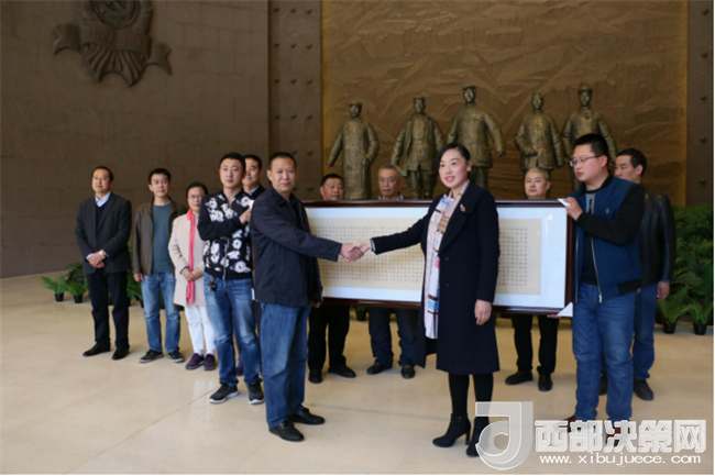 西部決策網(wǎng)——西部大開發(fā)訊(帥華鋒 通訊員 柴金霞 陳彥榮)“三月的南梁,大地處處蕩漾著春的漣漪.....”在這生機勃勃、春意盎然的美好時節(jié),中國書法家協(xié)會會員、首屆《世界華人運動大會書畫展》楷書評委、清心齋主人趙倉老師一行,帶著對革命老區(qū)的深情厚誼和對劉志丹、謝子長、習仲勛等革命先輩舍生忘死、救民出水火的崇敬之意來到革命圣地——南梁,向紀念館捐贈書法作品《長恨歌·習仲勛》。本作品系趙倉老師艱辛創(chuàng)作的佳品力作,飽含了趙倉老師豐厚的文化內涵,真實再現(xiàn)了習仲勛老人不畏艱難、矢志堅守的人生壯麗詩篇。