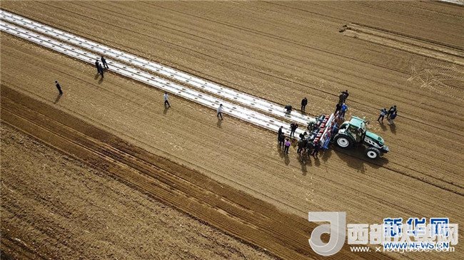 在新疆庫車縣牙哈鎮(zhèn)的一處棉田,“智能拖拉機(jī)”在進(jìn)行播種作業(yè)(3月23日無人機(jī)拍攝)。國家統(tǒng)計局4月17日發(fā)布數(shù)據(jù),初步核算,一季度國內(nèi)生產(chǎn)總值198783億元,按可比價格計算,同比增長6.8%。 新華社記者 胡虎虎 攝