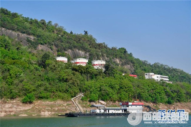 在長江重慶萬州區(qū)段,一處水上加油站掩映在綠樹之中(4月8日攝)。