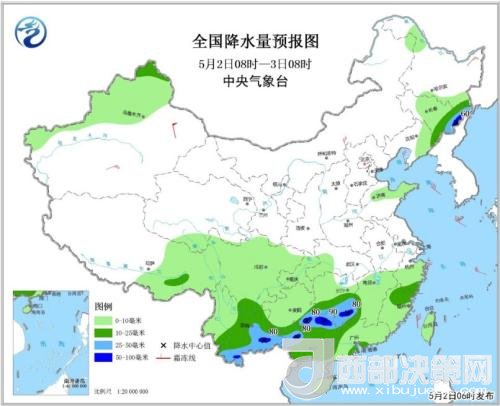 5月2日08時(shí)至3日08時(shí),吉林東部、湖南南部、貴州南部、廣西大部、云南南部等地的部分地區(qū)有中到大雨,其中,吉林東部、湖南南部、貴州東南部、廣西北部和西部、云南南部等地局地有暴雨(50~90毫米);上述局部地區(qū)將伴有短時(shí)強(qiáng)降水等強(qiáng)對(duì)流天氣。新疆北部和南疆盆地東部、內(nèi)蒙古中西部、遼東半島等地有4~6級(jí)風(fēng);新疆南疆盆地等地的部分地區(qū)有揚(yáng)沙或浮塵天氣(見(jiàn)圖1)。