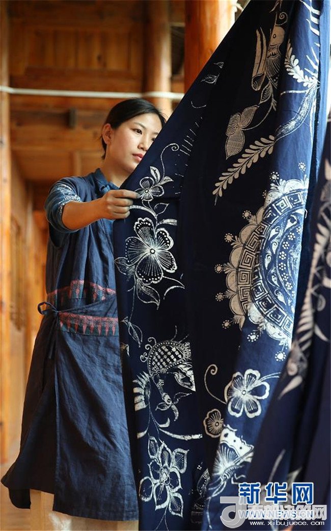 5月2日,在貴州省丹寨縣,張義蘋在查看蠟染產(chǎn)品品質(zhì)。