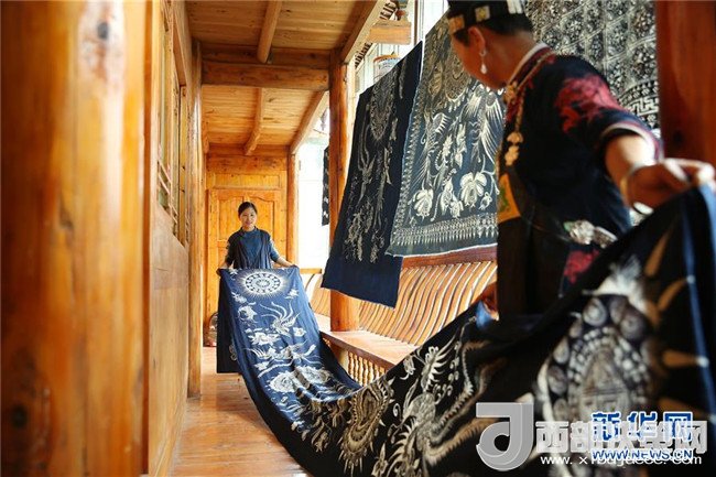 5月2日,在貴州省丹寨縣,張義蘋(左)與母親一起晾曬蠟染制品。