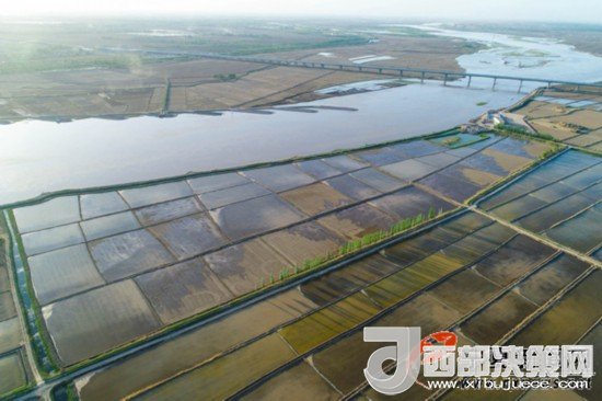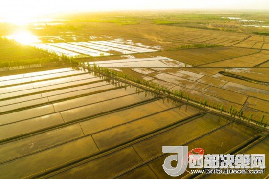 5月6日18時50分許,伴著落日金色的余暉,銀川市賀蘭縣黃河邊剛剛灌水的稻田波光粼粼,銀川平原引黃灌區(qū)稻田灌水,即將進(jìn)入插秧季。 寧夏新聞網(wǎng)記者 祁瀛濤 攝