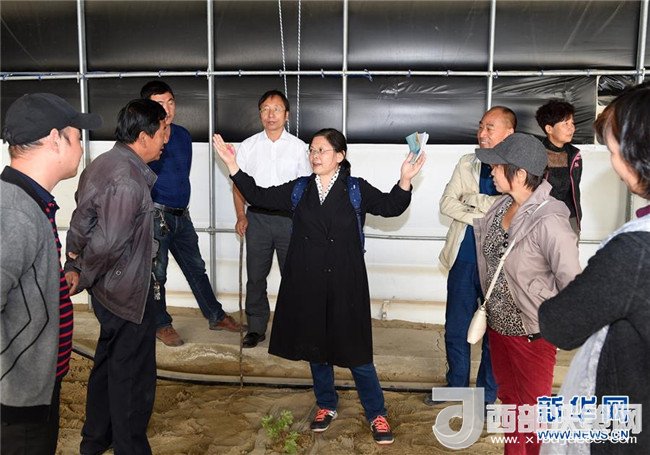 在新疆和田國(guó)家農(nóng)業(yè)科技園先導(dǎo)區(qū)葡萄示范種植大棚,從北京專程趕來的葡萄專家徐海英(中)為當(dāng)?shù)厝罕妭魇谄咸逊N植管理技術(shù)(4月19日攝)。