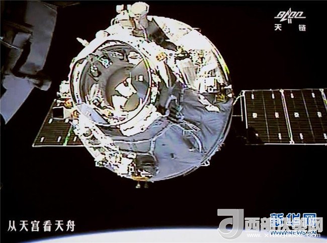 2017年4月22日12時23分,天舟一號與天宮二號順利完成自動交會對接。這是天舟一號與天宮二號進行的首次自動交會對接,也是我國自主研制的貨運飛船與空間實驗室的首次交會對接。圖為北京航天飛行控制中心大廳大屏幕上顯示的天舟一號向天宮二號靠攏的畫面(2017年4月22日攝)。新華社發(fā)(王泗江 攝)