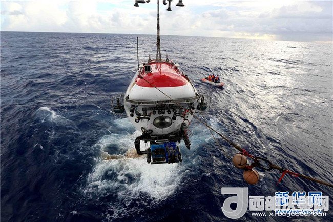 “蛟龍”號完成下潛后回到“向陽紅09”船甲板(2017年6月13日攝)。新華社記者劉詩平攝