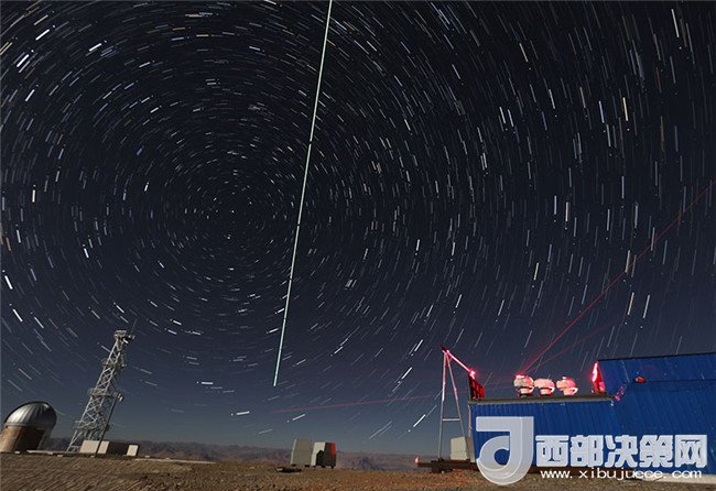 在西藏阿里觀測站,“墨子號”量子科學(xué)實驗衛(wèi)星過境,科研人員在做實驗(2016年12月10日攝,合成照片)。新華社記者 金立旺 攝