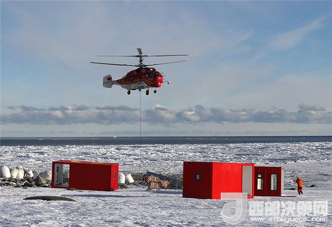 船載“雪鷹12”Ka——32直升機將物資吊運至恩克斯堡島新建站區(qū)(2017年12月9日攝)。新華社記者 白國龍 攝