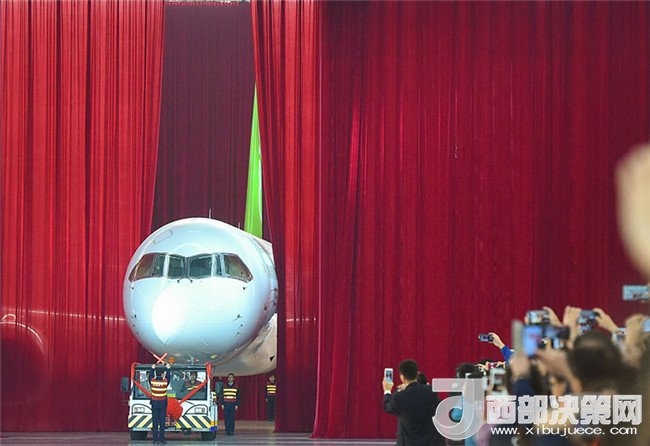 我國自主研制的C919大型客機首架機,在中國商飛公司總裝制造中心浦東基地廠房內(nèi)正式下線(2015年11月2日攝)。新華社發(fā)(裴鑫 攝)