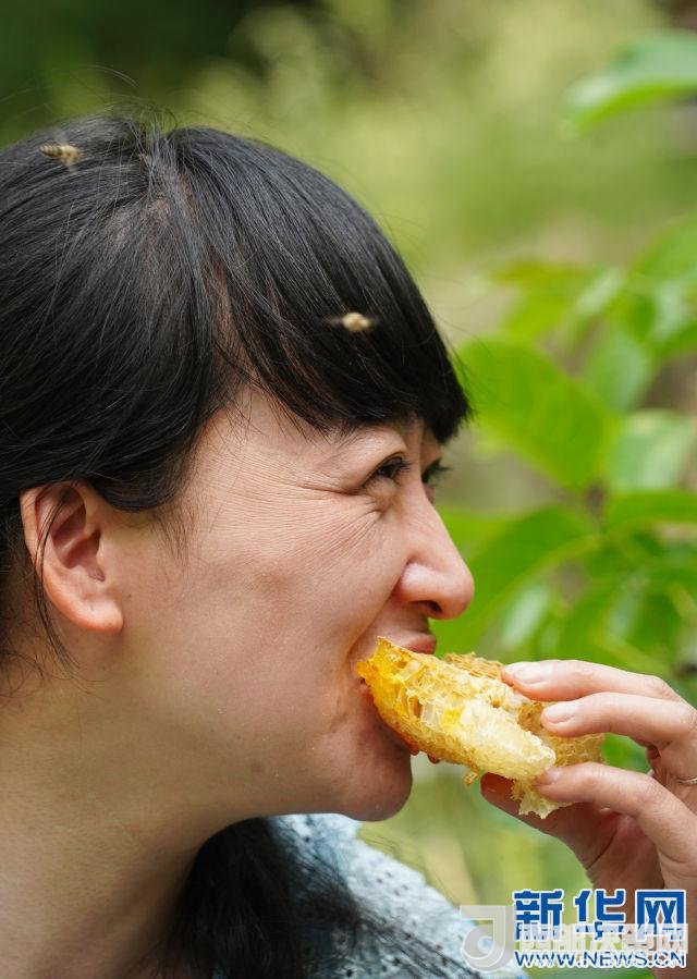 6月1日,一名游客在黃龍縣石堡鎮(zhèn)油坊窯蜂場(chǎng)內(nèi)品嘗蜂蜜。新華社記者邵瑞攝