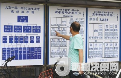 6月6日,考生家長在101中學(xué)校外觀看考場分布圖。