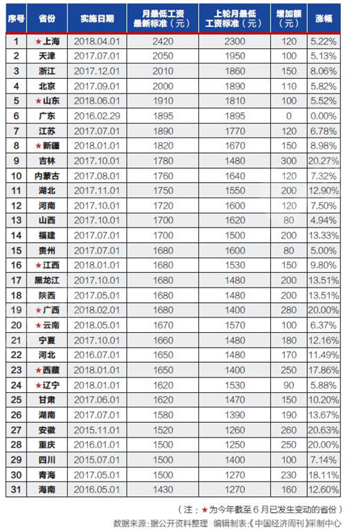 《中國經(jīng)濟周刊》記者計算得出,2018年上調最低工資標準的8個省份,平均調增幅度為9.95%,僅廣西(20.00%)、西藏(17.86%)兩省份的調增幅度超過了11%的平均數(shù),廣西的增加額最大,達280元,西藏的增加額也達到了250元。