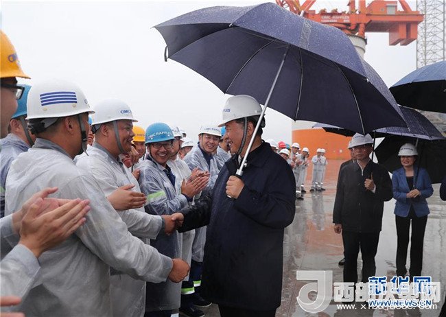 風(fēng)急云低,雨流如注。13日下午,習(xí)近平來到中集來福士海洋工程有限公司煙臺(tái)基地。作為國內(nèi)率先進(jìn)入海洋工程行業(yè)的企業(yè),中集來福士用10年左右時(shí)間,國產(chǎn)化率從不足10%提高到60%。在廠區(qū)碼頭上,習(xí)近平撐著雨傘,趟著積水,近距離察看??吭谶@里的自升式修井生活平臺(tái),遠(yuǎn)眺“藍(lán)鯨1號(hào)”超深水雙鉆塔半潛式鉆井平臺(tái)、“泰山”龍門吊、海洋牧場平臺(tái),向企業(yè)負(fù)責(zé)人詳細(xì)了解高端海洋工程設(shè)備制造、維護(hù)、運(yùn)行情況。海風(fēng)吹起了衣襟,雨水打濕了褲腿。習(xí)近平站在雨中,同圍攏過來的工人們一一握手、親切交談,向作業(yè)平臺(tái)上的工人們揮手致意。習(xí)近平指出,國有企業(yè)特別是中央所屬國有企業(yè),一定要加強(qiáng)自主創(chuàng)新能力,研發(fā)和掌握更多的國之重器。國有企業(yè)要深化改革創(chuàng)新,努力建成現(xiàn)代企業(yè)。要堅(jiān)持黨對(duì)國有企業(yè)的領(lǐng)導(dǎo)不動(dòng)搖,堅(jiān)持建強(qiáng)國有企業(yè)基層黨組織不放松,為做強(qiáng)做優(yōu)做大國有企業(yè)提供堅(jiān)強(qiáng)組織保證。