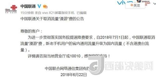 繼中國(guó)移動(dòng)之后,中國(guó)聯(lián)通也于同日通過(guò)官方微博宣布:自2018年7月1日起,中國(guó)聯(lián)通取消流量“漫游”費(fèi),新老手機(jī)用戶的省內(nèi)通用流量升級(jí)為國(guó)內(nèi)流量(不含港澳臺(tái)流量)。