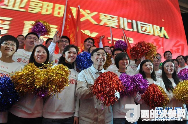 在2012年3月4日舉行的“中央企業(yè)郭明義愛(ài)心團(tuán)隊(duì)”授旗儀式現(xiàn)場(chǎng),郭明義與愛(ài)心團(tuán)隊(duì)合影。新華社發(fā)(胡慶明 攝)