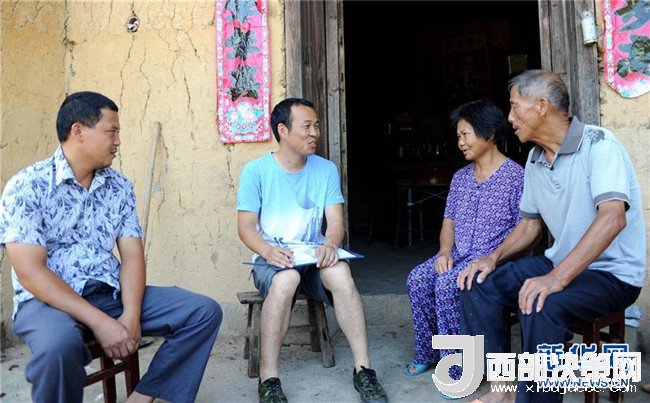 在江西永新縣三灣鄉(xiāng)三灣村,邢鐳(左二)在74歲的村民段老金家里了解土坯房改造情況(2013年8月10日攝)。邢鐳來(lái)自湖北,在三灣鄉(xiāng)扎根9年,2017年他剛剛帶領(lǐng)三灣鄉(xiāng)脫貧摘帽。新華社記者 周科 攝