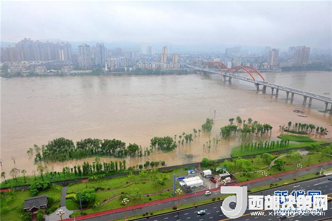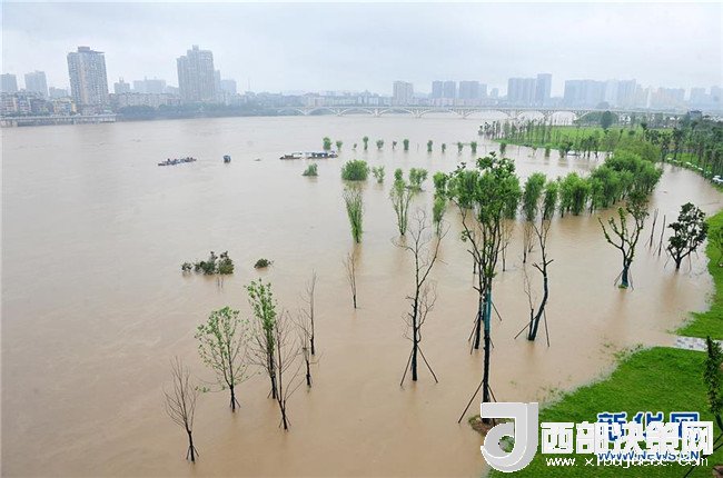 7月3日,在四川省南充市,嘉陵江南充主城區(qū)段洪峰過境,沿岸大量綠地被淹。 新華社發(fā)(樂校臣 攝)