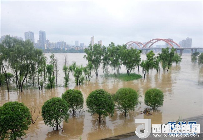 7月3日,在四川省南充市,嘉陵江南充主城區(qū)段洪峰過境,沿岸大量綠地被淹。新華社發(fā)(樂校臣 攝)