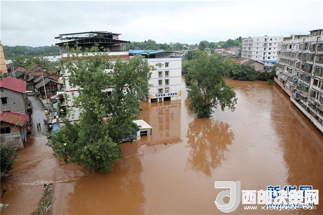 7月3日,四川省內(nèi)江市東興區(qū)田家鎮(zhèn)的小青龍河水位上漲,河邊部分民房被淹。新華社發(fā)(蘭自濤 攝)