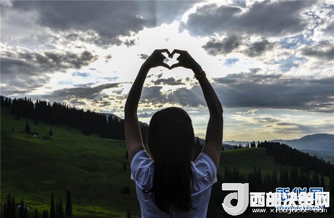 在那拉提景區(qū)天成臺(tái),一位游客迎著夕陽(yáng)做出了“心”的動(dòng)作(7月8日攝)。
