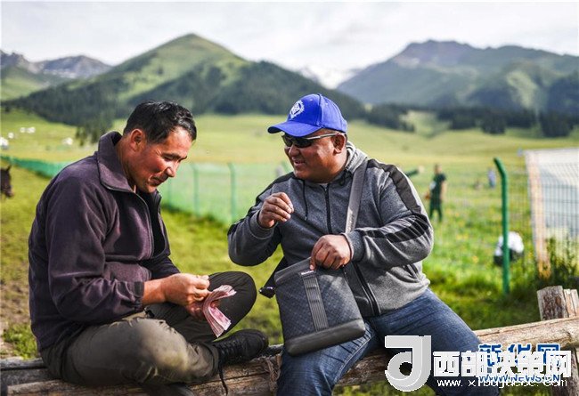 那拉提“空中草原”游牧人家馬隊(duì)的兩位牧民正在數(shù)當(dāng)日的收入(7月8日攝)。